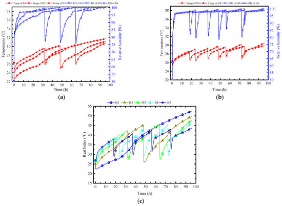 Indoor air temperature and humidity variation under different batch strategies: (a) 1, 2, 3 batches; (b) 4, 5 batches; (c) HI.