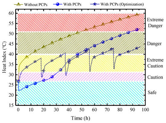 Figure 28 demonstrates the comparison of the HI in MRC in three scenarios: without PCPs, with PCPs, and the optimization approach by using PCPs with 5 batches. In China, the normative time requirements for MRC are 96 h. The result shows that without PCPs, the indoor HI rises continuously, reaching 60 °C. The duration in the danger zone is 41 h, and in the extreme danger zone, it is 44 h. Therefore, sustained human survival is not viable in this environment, and a thermal control system needs to be implemented. With the deployment of PCPs for cooling, there is a significant reduction in the indoor HI. However, the late-stage thermal indicators remain high, with a danger zone duration of 41 h, and an extreme danger zone duration of 10 h. Despite the improvement, it is still unfavorable for survival. Through optimization in batches, as a result, compared to the pre-optimized scenario, the duration in the danger zone is shortened to only 24 h, all at a lower level (below 45 °C), and the extreme danger zone is completely eliminated. It can be foreseen that by strategically increasing a small number of PCPs in batches 3, 4, and 5, complete control of the thermal and humid environment with no danger zone for 96 h can be achieved, which is crucially significant for the survival of trapped personnel.