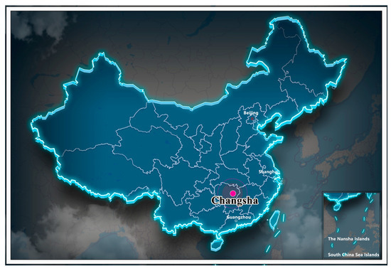 The field investigation was performed at Hunan University in Changsha, which is located in central China (latitude 27°51′–28°40′ N and longitude 11°53′–114°15′ E), as shown in Figure 1, with abundant precipitation. Changsha has a warm climate in the summer (the average temperature in July is about 29 °C) and a cold climate in the winter (the average temperature in January is about 5 °C) [35]. Meanwhile, the outdoor relative humidity is often higher than 70% throughout the year.
