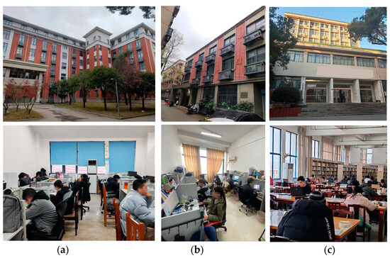 The investigation was performed in the office and study rooms of three buildings of Hunan University (as shown in Figure 2), including the main hall of the College of Civil Engineering (Building A), the Research Center for Green Building Energy Efficiency and Green Buildings (Building B), and the Library of Hunan University (Building C). All three buildings had reinforced concrete structures, with a total of six floors in Building A, three floors in Building B, and nine floors in Building C. Each room had several operable single-glazed windows and split-type air conditioners, and each air conditioner had a plug-in controller panel for the occupants to freely change the indoor set-point temperature. Each window was closed, and each air conditioner was running during the investigation. In general, the air conditioning was turned on at around 8 a.m. on weekdays, when the earliest occupants entered the office, and it was turned off when the last occupant left the office, depending on when the occupants finished their work.
