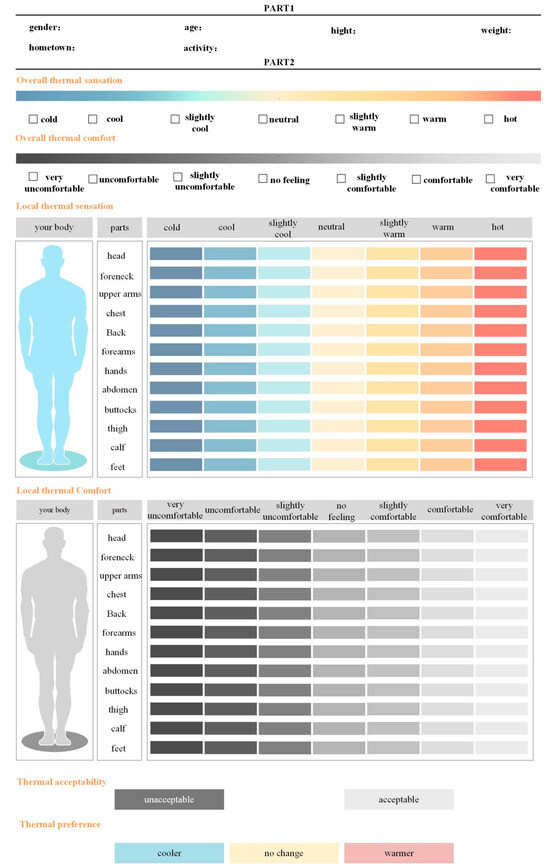 Before conducting the survey, each student who participated gave their oral consent. Second, the questionnaire was administered to subjects who had been seated in the office for more than 30 min. Third, the questionnaire was explained orally to each participant by the researchers. Figure 3 shows the main questions of the used questionnaire. The participants selected the most proper thermal sensation and comfort levels from an integer seven-point scale (from ‘‘cold” to ‘‘hot” and from ‘‘very uncomfortable” to ‘‘very comfortable”, with the corresponding values ranging from −3 to 3). In addition, the participants were asked to choose whether the indoor thermal environment was “acceptable” or “unacceptable” (the corresponding values were 1 and 0, respectively). The specific scales are shown in Table 2.