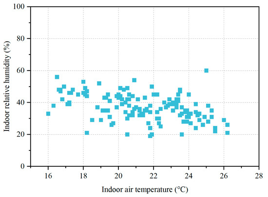 During the survey period, the main outdoor temperatures in Changsha were 5.8–14.5 °C, and the outdoor humidity was mainly 60–100%. Figure 4 illustrates the indoor temperatures and indoor humidity during the survey period. The average indoor temperature and humidity were 20.4 °C and 39.7%, respectively, and most of the rooms had temperatures higher than 18 °C.