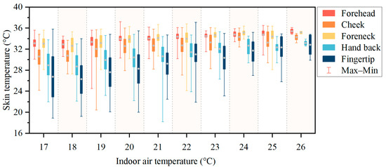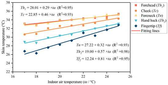 Figure 6 shows the regression results of local skin temperatures and indoor temperatures. Local body parts had larger skin temperature differences as the indoor environment became cool. For example, when it was 17 °C indoors, the difference between the forehead and the fingertips was 6.5 °C, and, when it was 26 °C indoors, the skin temperature difference was merely 2.6 °C.