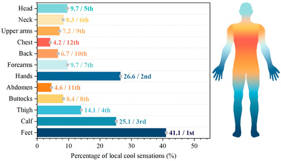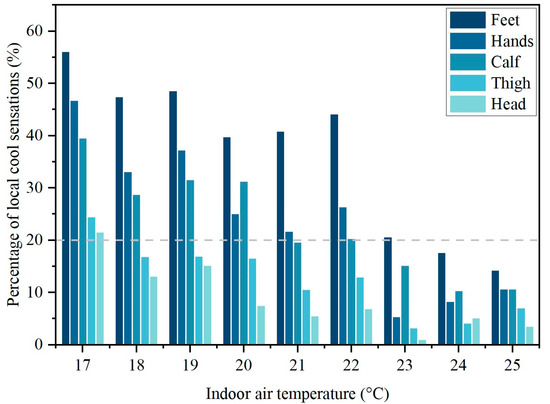 (1) In terms of local cool sensations, body extremities were the main areas prone to have cool sensations, and the top-five-ranked local cool sensation percentages were those of the feet (41.02%), the hands (26.58%), the calves (25.18%), the thighs (13.99%), and the head (9.72%). The highest percentage of local cool sensation was always in the feet, regardless of the indoor temperature. Moreover, the percentage of local coolness in the feet, hands, and lower legs increased rapidly as the room temperature decreased. When the indoor temperature decreased by 1 °C, the percentages of local cool sensations of the feet, hands, and lower legs increased by 3–14%. Moreover, there was a significant cool sensation in the head when the temperature was higher than 18 °C indoors.