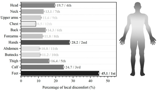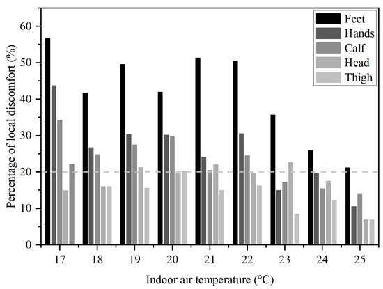 Figure 9 shows the percentages of different local body parts that had discomfort. The body extremities were prone to experience discomfort. Specifically, the higher percentages of local discomfort appeared in the feet (44.99%), the palms (28.2%), the calves (24.74%), the head (19.66%), and the thighs (16.35%). It also should be noted that the head could also have notable discomfort in the winter despite the indoor temperatures being usually higher than 18 °C (see Figure 4).