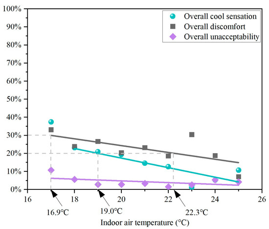 Figure 11 represents the percentages of participants having overall cool sensations (voting “slightly cool”, “cool”, or “cold”), uncomfortable feelings (voting “slightly uncomfortable”, “uncomfortable”, or “very uncomfortable”), and thermal unacceptability (voting “unacceptable”) under the different indoor temperatures in this study. It is obvious that, under the same indoor temperature, the percentage of overall discomfort was higher than that of the overall cool sensation, and the percentage of unacceptability was usually less than 10%, regardless of what the indoor temperature was. Moreover, less than 30% of the participants was cool and uncomfortable when it was 17 °C or higher indoors. When it was 19 °C or higher indoors, less than 20% of the participants felt cool sensations, and, when it was 22.3 °C or higher indoors, less than 20% of the participants felt discomfort. The above-stated results also indicate that considering only thermal acceptability may lead to a large overestimation of occupant thermal comfort in real buildings.