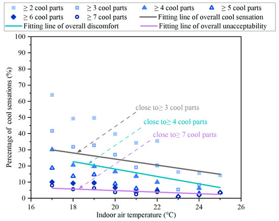 Specifically, the percentage of at least four cool body parts was similar to that of the overall cool sensation, with an average absolute difference of 1.1%. The percentage of at least three cool body parts was similar to that of the overall discomfort, with an average absolute difference of 2.3%. At the same time, the percentage of at least seven cool body parts was similar to that of the overall unacceptability, with an average absolute difference of 0.2%.