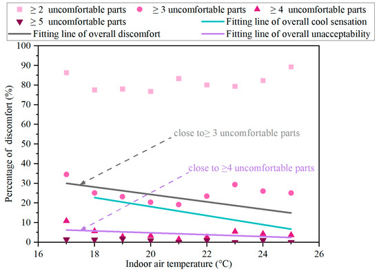 First, the overall percentages of cool sensations (including “slightly cool”, “cool”, “cold”, and “very cold”), discomfort (including “slightly uncomfortable”, “uncomfortable”, and “very uncomfortable”), and thermal unacceptability were calculated. Then, the bin method was adopted for data analysis. Specifically, the data under different air temperatures were assigned to different integer temperature bins with an interval of 1 °C, and the integer temperature value was used as the standard temperature for each bin, based on which the key data for our analysis such as the thermal discomfort percentages were calculated at different integer temperature values. For example, the thermal comfort values under indoor air temperatures of 18.7 °C, 18.9 °C, and 19.1 °C were within the “18.5–19.5 °C” range and then were assigned to the temperature bin of 19.0 °C, which was taken as the standard temperature for the above-mentioned thermal comfort values. Afterward, the relationship between the amount of cool and uncomfortable local body parts and the overall subjective responses was analyzed using the above-mentioned percentage data.