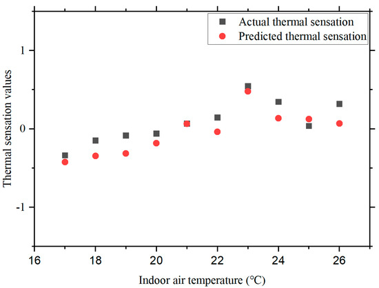 Figure 14 shows the actual and predicted overall thermal sensation values under different indoor temperatures, which were obtained using the bin method, as described in Section 2.6, while the detailed results are represented in Table 4. It can be seen that the average deviation of the model is 0.13, and most of the deviations are lower than 0.2, which demonstrates that the local–overall thermal sensation model proposed by the authors (model (1)) has a high accuracy level.