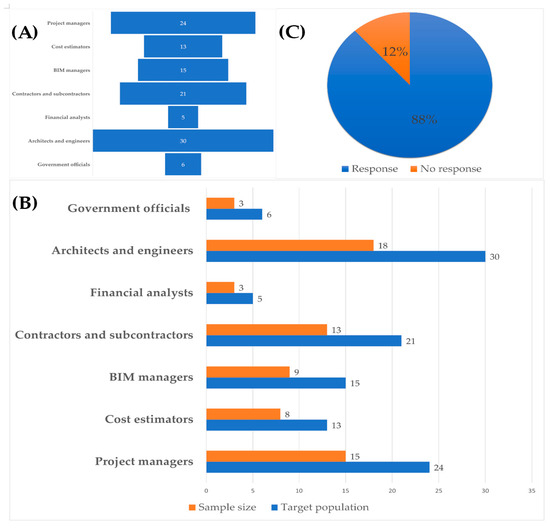 The selection of 69 respondents out of a population which was made up of 114 individuals was performed through stratified random sampling, as shown in Figure 2B. The different strata comprised project managers, cost estimators, BIM managers, contractors, financial analysts, architects, and government officials. A proportional allocation approach determined the number of respondents per stratum. In each stratum, the selection was performed using a random sample technique to avoid bias and ensure the findings were generalizable and reliable.