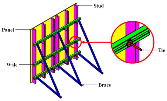 Overall, many dimensional quality inspections in construction projects have been beneficially explored with 3D point cloud data. However, the spacing measurement of formwork system members has received little attention. Formwork systems are different from the previously studied objects mentioned above (e.g., reinforcing bars, concrete slabs, steel columns, scaffolding platforms). There are specific force transfer features, material properties, and design standards for the formwork system, and it has unique members and layouts. A typical formwork system is composed of panels, studs, wales, ties, and braces that are installed following a fixed relative position order (Figure 1), which makes it difficult for previous studies to be applied to such members and layouts. Therefore, a specific methodology for the spacing measurement of formwork system members using 3D point cloud data needs to be developed. In particular, considering the purpose of enhancing the automation of the spacing measurement of formwork system members, it is essential and meaningful to conduct a specialized study for the segmentation, identification, and recognition of members according to the characteristics of the formwork system.