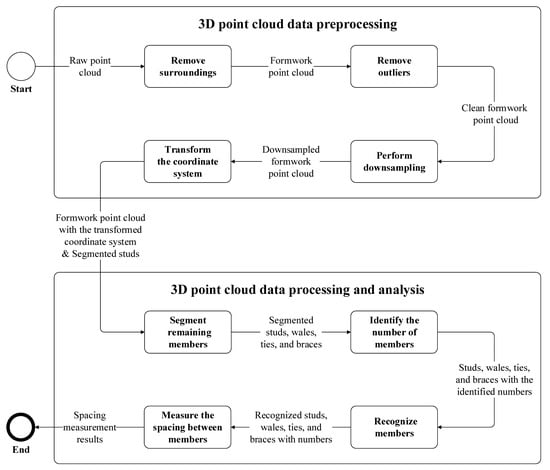 This section elaborates on the proposed framework for the spacing measurement of formwork system members with 3D point cloud data. This research focuses on the preprocessing, processing, and analysis of 3D point cloud data; therefore, the data acquisition process is out of our scope (i.e., 3D point cloud data have already been obtained). The proposed framework is divided into two parts: (1) 3D point cloud data preprocessing and (2) 3D point cloud data processing and analysis (Figure 2). Each part is detailed below.