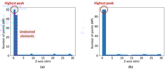 In some cases, the ground is close to formwork system members, which makes it difficult to be removed completely. Generally, the number of points that belong to the ground is significantly higher than that of formwork system members along the normal direction of the ground. In other words, a histogram of the number of points along the Z-axis of the point cloud has different peaks. The highest peak in the histogram would represent the ground level (i.e., a higher number of points), and it can be easily distinguished from lower peaks representing the formwork system members close to the ground (i.e., a lower number of points), which is also an advantage compared to other point cloud fitting techniques, such as the random sample consensus algorithm (RANSAC) that needs to know which plane represents the ground. For this reason, the single-peak detection algorithm can be applied to remove the ground. To generalize this and consider the cases when other elements are close to the ground (e.g., clutter or other materials on the ground next to the formwork system members), the bin interval can be adjusted to include the points of these elements depending on the type of conditions investigated. For example, when the bin interval is set to 1 dm, the second-highest peak representing the undesired elements would not be removed by the single-peak detection algorithm (Figure 3a). When the bin interval is adjusted to 2 dm, those undesired elements are placed at the highest peak (Figure 3b); thus, they can be removed successfully.