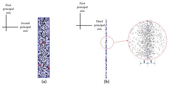 In order to determine the transformed coordinate system, the principal component analysis (PCA) is applied according to the detected stud front surface (Figure 5c). The first, second, and third principal axes of the transformed coordinate system correspond to the long side, short side, and normal directions of the detected stud front surface, respectively. With respect to the PCA [], the first principal axis of the transformed coordinate system is determined so that the distribution variance of the projection of all the points of the detected stud front surface is maximized on this coordinate axis (i.e., the first principal component). The second principal axis is determined so that the distribution variance is maximized on the one that is orthogonal to the first coordinate axis (i.e., the second principal component). Finally, the last principal axis is the one orthogonal to the first and second principal axes (i.e., the third principal component).