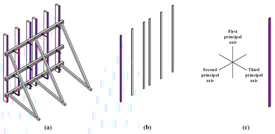 For wales that are installed along the first principal axis, the wale with the smallest mean value on the first principal axis among its same category is located on the bottommost or topmost from the front view and is numbered “1”. The brace with the second smallest mean value is located immediately to the top or bottom of it and is numbered “2”, and the rest of the wales can be deduced by analogy (Figure 8c).