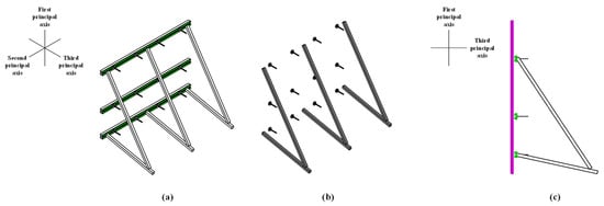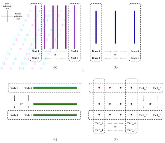 For studs and braces installed along the second principal axis, the stud or brace with the smallest mean value on the second principal axis among its same category is located on the leftmost or rightmost from the front view and is numbered “1”. The stud or brace with the second smallest mean value is located immediately to the right or left of it and is numbered “2”, and the rest of the studs or braces can be deduced by analogy (Figure 8a,b).
