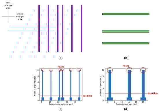 Considering such characteristics, the multiple-peak detection algorithm is utilized to identify the number of studs and wales because they have been previously segmented into different sets of points with all formwork system members in their respective categories. For the multiple-peak detection algorithm, the number of points for studs or wales is averaged into a baseline over the range of the second or first principal axis, and the number of points in each set bin is counted sequentially. If the number of points first exceeds and then falls below the baseline, it is considered a stud or wale (Figure 7c,d). The numbers of studs and wales are identified utilizing the multiple-peak detection algorithm instead of other point cloud clustering techniques, such as DBSCAN, because the points that belong to a stud or wale, occluded by other formwork system members, are separated and cannot be clustered well.