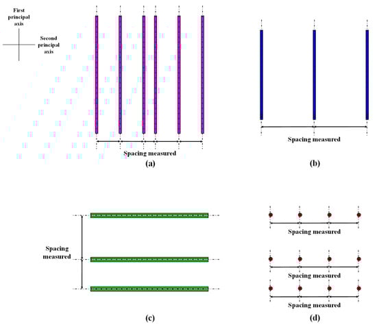 The fourth step is to measure the spacing between formwork system members in each category. For studs and braces that are installed along the second principal axis, the spacing to be measured corresponds to the horizontal spacing from the front view (Figure 9a,b). For wales that are installed along the first principal axis, the spacing to be measured corresponds to the vertical spacing from the front view (Figure 9c). For ties that are not solely installed along the first or second principal axis, the spacing to be measured corresponds to the horizontal spacing from the front view because their vertical spacing has been controlled by wales (Figure 9d).