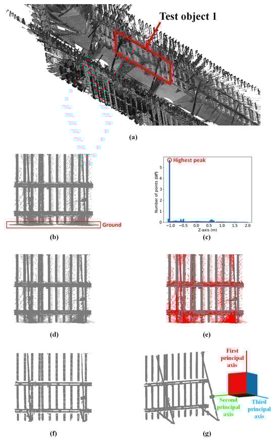 First, the surroundings of the formwork system were removed from the raw point cloud (Figure 11a). The thresholds of the pass-through filter were set according to the coordinates of points for the formwork system viewed on CloudCompare Version v2.12.2 [], and the raw point cloud was filtered to the desired portion (Figure 11b). To remove the ground, the number of points in each bin with an interval of 0.05 m was counted on the Z-axis of the histogram. The highest peak was considered as the ground level (Figure 11c), and the points on the ground level and below were removed (Figure 11d).