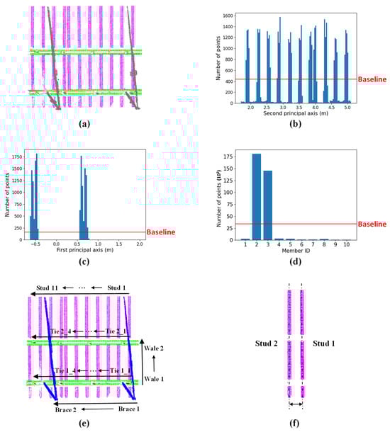 3D point cloud data processing and analysis: (a) the segmentation of the different categories of formwork system members; (b) the histogram of the number of points for the studs on the second principal axis; (c) the histogram of the number of points for the wales on the first principal axis; (d) the histogram of the number of points for the ties and braces; (e) the recognition of the formwork system members in each category; and (f) the spacing between Stud 1 and Stud 2.