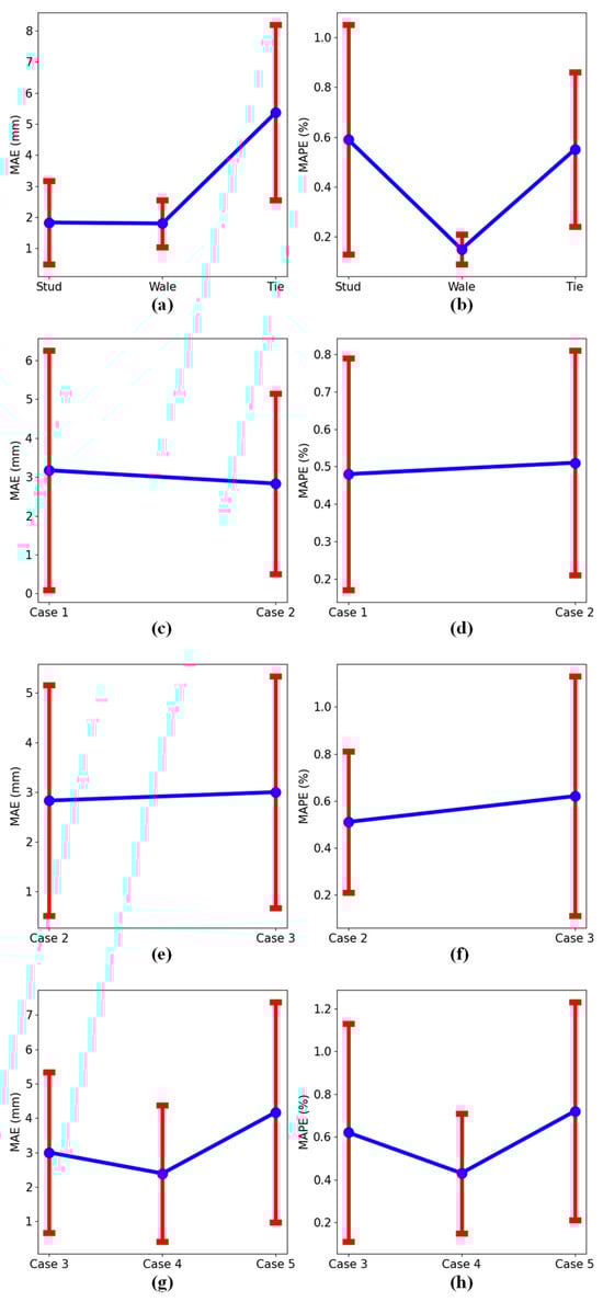 The comparison of the spacing measurement results with error bars is shown in Figure 13. The means are represented by blue dots, and the means ± standard deviation are represented by upper and lower red caps, respectively. The comparison of the stud, the wale, and the tie is shown in Figure 13a,b. The brace is removed from the comparison as there is only one result and, therefore, no variation. The performance of the wale was better whether in the MAE or the MAPE, and the performances of the tie and the stud were worse in the MAE and the MAPE, respectively. The reasons may be that (1) the wale was large in size and less occluded by other members, so the scanning effect was relatively good; (2) the tie was the smallest in size and made out of a higher reflective surface (i.e., metal), so the scanning presented less density and quality; thus, it performed relatively poorly in the MAE; and (3) the stud was not worst in the MAE but had a relatively poor performance in the MAPE due to its small spacing. The comparison of Case 1 and Case 2 with different test objects is shown in Figure 13c,d. The performances of the two cases were similar, indicating that the proposed approach was robust within the conditions of the tested cases. The comparison of Case 2 and Case 3 with different numbers of scans is shown in Figure 13e,f. The performance of Case 2 was slightly better than that of Case 3, suggesting that the increase in the number of scans was beneficial in improving the scanning effect (as expected). The comparison of Case 3, Case 4, and Case 5 with different distances of scans is shown in Figure 13g,h. The performance of Case 4 was better than that of the other two cases, and the performance of Case 5 was worse than that of Case 3, which suggested that the distance of scans should be moderate, and too far or too close was not good.