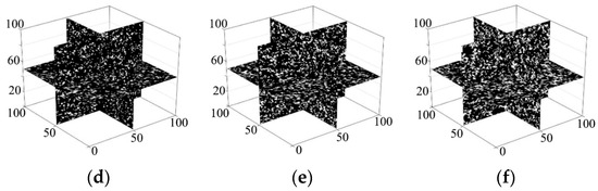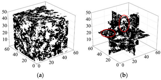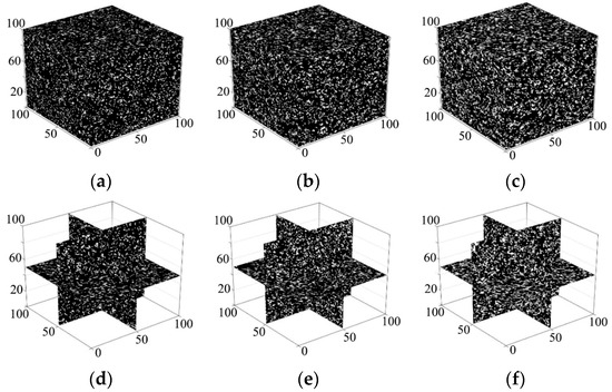 Utilizing the QSGS method, which manipulates control parameters such as the pc, pd, pimq, and n, the diverse porosity levels of 3D mesoscopic structural models of porous concrete can be modeled, with dimensions of 100 × 100 × 100 lattice points. The specific model construction schemes are outlined in Table 2, and the resulting mesoscopic structural models of porous concrete are illustrated in Figure 3, Figure 4 and Figure 5. In these models, the solid phase is represented in black, while the pore phase is depicted in white. Varying the pc value enables control over the size of the pores within the porous concrete, with smaller pc values resulting in larger pores.