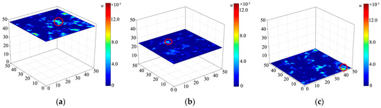 Using the QSGS-LBM combined simulation method, the permeability characteristics of porous concrete were simulated, as illustrated in Figure 7, Figure 8 and Figure 9. Figure 7 shows the velocity field distribution at the inlet, middle, and outlet sections of the porous concrete. It is evident from Figure 7 that the velocity field distributions vary across different sections of the porous concrete, correlating with the diverse pore distributions of the modeled porous concrete. Moreover, Figure 7 reveals localized areas of higher brightness in the velocity field slices, indicating regions where the percolation velocity is significantly higher compared with other areas, with velocities reaching above 0.0140 lattice units, as circled in red in Figure 7a,b.