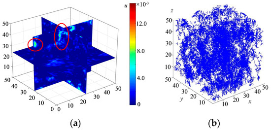 To further investigate the permeability of the porous concrete model modeled based on the QSGS mentioned above and to ensure a more intuitive visualization of seepage simulation, the porous concrete model with the highest porosity (n = 0.25) in Scheme 1 is taken as an example. The LBM is employed to simulate the fluid (water) percolation process within the internal pores of the porous concrete, aiming to calculate its permeability and thus quantitatively evaluate its permeability capacity. Furthermore, considering the substantial computational memory required and the low efficiency of simulating fluid flow in large-scale models, this research adopts the strategy of reducing the model size, as suggested in the literature [6]. Specifically, a porous concrete model of 50 × 50 × 50 lattice points (as shown in Figure 6) is used for the permeability simulation. Reflecting the real application of porous concrete as a permeable base layer or pavement structure where rainwater primarily infiltrates from top to bottom, the direction of pore flow in the porous concrete model is similarly set to proceed along the depth of the model. An inlet and outlet pressure difference of 0.012 lattice units is applied to simulate infiltration. The computational domain is selected to be a grid area of 50 × 50 × 50 lattice points, with other related settings and calculation parameters remaining consistent with those in the previously verified examples.