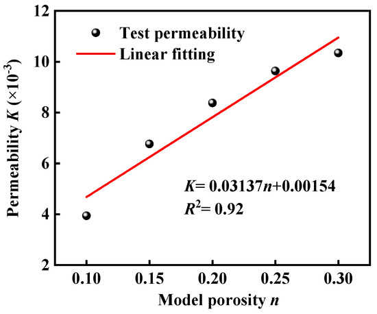 (3) A highly linear relationship exists between the permeability and porosity of porous concrete models. The Pearson correlation coefficient is as high as 0.92, which is consistent with the relationship between the permeability and porosity of real porous concrete.
