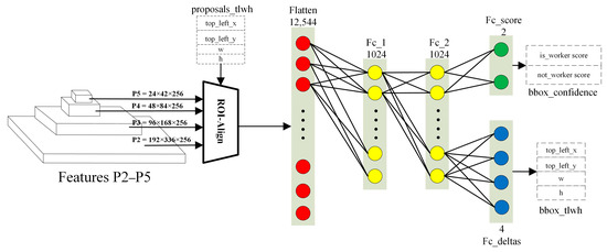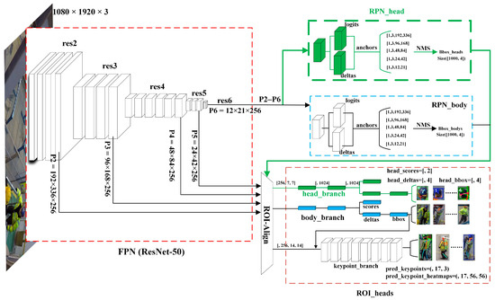 | Already follow the first procedure to assemble a head_integrated Keypoint R-CNN model. Already downloaded the weights file of “.pth”. 1: Input: the current frame #t (contains M workers in real from #0 to #t-1); 2: Feed the frame #t into the model and run, let the outputs contain N1 heads and N2 bodies: The frame resolution = 1080 × 1920 × 3; Feature Pyramid Network (FPN) sub-networks: outputs of five 256-channel feature maps; RPN sub-networks: outputs of 257,796 anchors/proposals for heads or bodies; Regions of interest (ROI) sub-networks: N1 heads and N2 bodies bounding boxes, respectively. Suppose N1 ≠ N2: the N1 head-index list = (0, 1, 2, 3, 4, 5, 6, 7, 8), the N2 body-index list = (0, 1, 2, 3, 4, 5). 3: ID association for (N2 bodies, N1 heads), detailed in our other papers: Suppose = ((None, 3), (5, 6), (0, 0), (1, None), (3, 2), (2, 5), (4, 7), (None, 4), (None, 8)) the 3rd, 4th, 8th head do not find matched body; the 1st body do not find matched head. 4: Linear interpolation: for i in length(3rd, 4th, 8th, … heads) do: if the head[i] is in the view: head_bounding box [i, t] = function (head [i, t-1], head [i, t-2]); for j in length(1st, … bodies) do: if the body[j] is in the view: body_bounding box [j, t] = function (body [j, t-1], body [j, t-2]; head [i, t-1], head [i, t-2]); 5: The Refinements networks: Feed the features and proposals of frame #t into the networks of the head or body: |