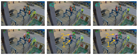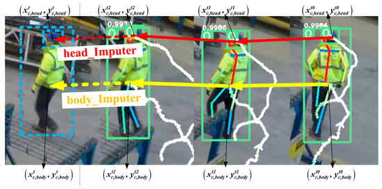 - In adjacent frames and under polar coordinates, keep the change of modulus and argument of the body-to-head’s center vector (green arrow line in Figure 7) no more than 0.5× head width and 5°. If it cannot be guaranteed, change the position of the center of the body-bounding box based on the center of the head.