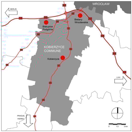 Kobierzyce Commune is an administrative unit that is divided into 32 districts with a total area of 149.3 square meters. It is situated in southwestern Poland (relatively close to the borders with Germany and the Czech Republic) in the Lower Silesian Voivodeship and inhabited by around 22,000 people (as of 31 December 2020) []. It is located south of Wrocław (one of the largest cities in Poland and the capital city of the Lower Silesian Voivodeship) and belongs to the Wrocław Metropolitan Area and the Wrocław Functional Area. Together with eight other administrative units, it is part of Wrocław County. At present, there are 33 towns and villages in the commune. Before World War II, this area belonged to the German Reich and was inhabited by the German population. After the war, along with the change in state borders and the settlement of these areas by Poles (displaced people from the Eastern Borderlands and Central Poland), a new administrative order was introduced.