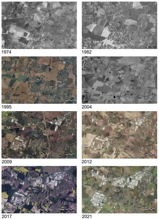 Intensive urbanization of the northern area of the commune, mainly in the area of the Bielany Junction and within the framework of the industrial park, changed the local landscape—the place of arable fields was taken by industrial facilities and large-scale trade and logistics bases. In the aerial photos from the years 1974–2021 in the northern part of the commune around the villages of Bielany Wrocławskie, Biskupice Podgórne and Tyniec Mały, we can see areas that were occupied almost exclusively by arable fields, which were gradually inferior to intensive developments (Figure 2).