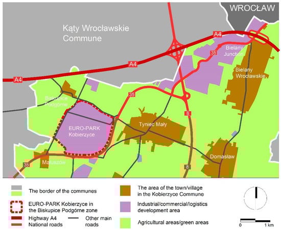 The analysis of the case study focuses on the investments that were implemented in the area of EURO-PARK Kobierzyce in the zone of Biskupice Podgórne. It is an area with visible boundaries, limited by national road No. 35 in the east and south and spatially separated from the surrounding farmland in the north and west (Figure 3).