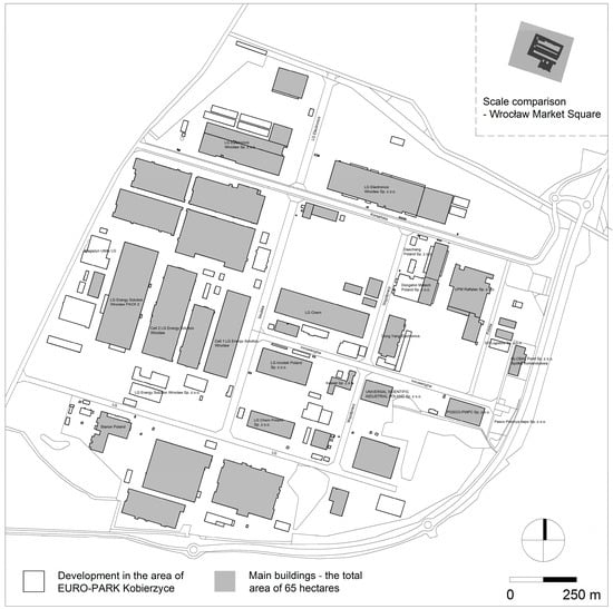 Then, the current state of the investment was analyzed, including architecture and land development, as well as the ownership status and information shared by the architectural studio on the website. In addition, a site visit was carried out and the materials available in the Wrocław County Spatial Information System [] were studied. Finally, it was also checked whether the industrial development completed in the analyzed area had obtained a quality certificate in terms of sustainable development and environmental impact (such as BREEAM or LEED). The information resulting from the analyses is presented in Section 3.3.3. A significant limitation of this study was the lack of detailed information on the development, including technologies and materials used, installation systems, operation, etc., as well as information on taking into account the principles of sustainable development in the design process. It resulted from the lack of contact from the architectural studio, despite making an attempt to do so. Moreover, it was not possible to obtain information about all the designers of the analyzed investments.