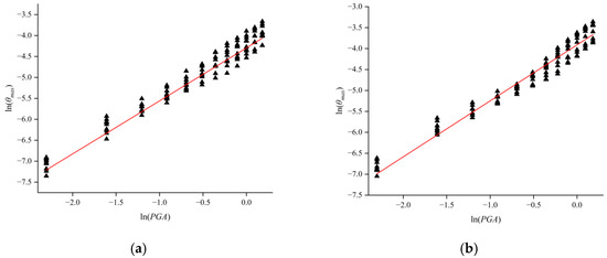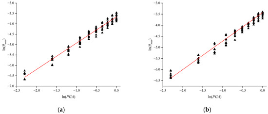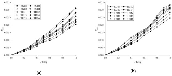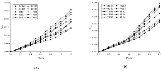- The IDA curve patterns of each group of seismic waves are basically consistent. When PGA > 0.3 g, the IDA curve appears nonlinear, and with the increase in PGA, the slope of the IDA curve increases gradually due to the stiffness degradation caused by structural damage under earthquake. For the same PGA, the structural displacement of BRBs is small, and the effect of the aftershock is larger than that of the main shock alone.