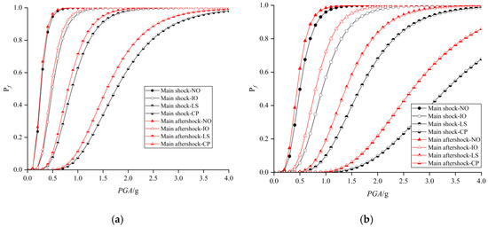 - The seismic vulnerability analysis shows that the exceeding probabilities of the two structures under the action of the main–aftershock sequence are greater than that under the action of the main earthquake alone. When the structures are in the normal operation stage, their vulnerability is less affected by earthquake sequences. In the other three stages, the gap between the vulnerability curves of the main and main–aftershock earthquake sequences gradually widens, and the structure exhibits a certain degree of plastic damage under the action of the main earthquake.