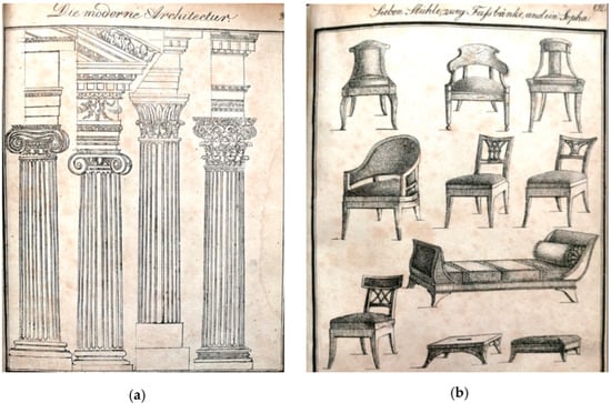 In the following centuries, books on architectural topics were published more frequently. Classical styles, orders, and details were still replicated: columns, cornices, windows and doors, gates, stairs, balustrades, etc. (Figure 2a). Some publications present the latest trends in furniture design []. The boards and drawings show furniture decorated in the spirit of the era. The examples represent the canons of beauty of the time, e.g., classicist or French Empire furniture. The latest models and current technical achievements that improve the comfort of everyday life are also shown: a secretary desk, other desks, a mechanically foldable bed and a table, etc. []. Some furniture to sit and lie on suggested the value of ergonomics (Figure 2b). They were probably comfortable and optimally suited to the human body.