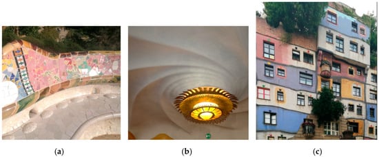 Natural forms in architecture and interiors: (a) fluid shapes of benches (A. Gaudi, Parc Güell in Barcelona); (b) swirling ceiling profiles (A. Gaudi, Casa Batlló in Barcelona); (c) irregular divisions of the flat façade (F. Hundertwasser, Hundertwasser House, Vienna).