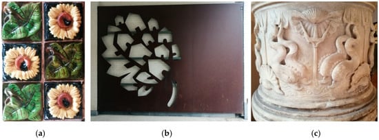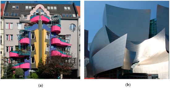Observing the surrounding world has always been an inspiration for technical and aesthetic creativity. The concepts and shapes of various technical objects are often modeled on the natural environment. This is referred to as, i.e., geometrically irregular tectonic divisions, lines, and solids (Figure 3). They fall into the trend of organic architecture. For centuries, various decorations with real and abstract forms have been part of the canon of beauty in visual arts, especially architecture. Decorating spaces was often synonymous with high social status (e.g., decorative details, jewelry), had symbolic or religious meaning (e.g., sculptures, images of deities and saints), and sometimes had practical meaning (e.g., masking and camouflage against attackers, illusion of grandeur). It was commonly used as a means to fill a void in the technical environment. The latter process became particularly visible in the 20th century, with the rejection of historical decorative forms in modern architecture and art.