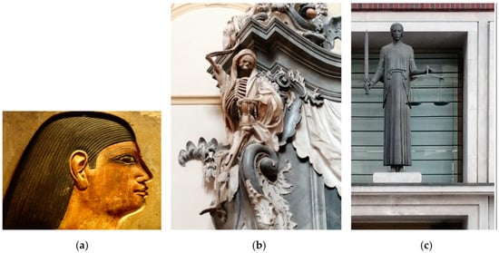 Anthropomorphic decorations as human beauty and its symbolic representation: (a) three-dimensional portrait of a beautiful woman from ancient Egypt (Vatican Museum); (b) human skeleton with an hourglass as the passage of time and death on a Rococo epitaph (church in Wroclaw); (c) Iustitia as law and justice (court building in Wroclaw).