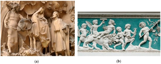 Building elements, interiors, and furniture were often decorated with various images and motifs seen in the surrounding space. The most popular were details and ornaments with plant and animal themes (Figure 4). The representations were realistic, more simplified, and sometimes fantastic and symbolic (sphinxes, dragons, griffins, etc.). The human body played a special role. Anthropomorphic forms covered building structures, elevations, interiors, and applied art products. The human figure was a decorative form (as a synonym for beauty), but also contained social, philosophical, religious, and existential content (Figure 5). The façades and furniture fronts were complemented by painted or carved genre scenes and symbolic allegories (Figure 6). The human body had a particularly practical significance in construction technology. It was a spatial model for shaping the built environment. Selected parts of the human body were also the basis for imperial measures of length, still used in many countries (inch, foot, yard).