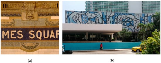 Geometric decorative elements in architecture and interiors: (a) geometric forms, Greek meander (signboard at a subway station in New York); (b) abstract, irregular forms (mural by A. Palamez, Habana Libre Hotel, Havana).