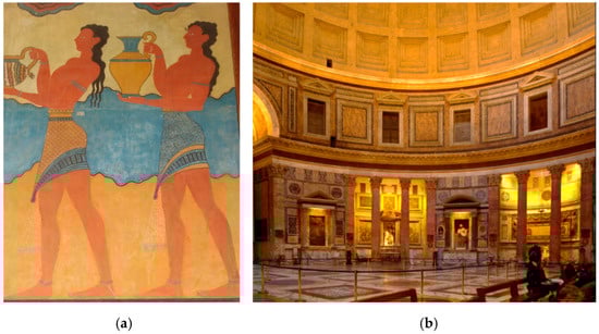 Greek canons and architectural orders were copied over the following centuries in ancient Rome. Innovative structures were used, such as semicircular vaults and domes. They made it possible to create interiors with a large area and volume. Colored marbles, painted plaster surfaces, and architectural stone details were frequently used in façades and interiors (Figure 8b). The beauty of Roman architecture is associated with decorative splendor in the form of flat and spatial ornaments, genre scenes, and intense colors. In turn, the varied usability of interiors can be recognized by analyzing the daily customs of the Greeks and Romans [].