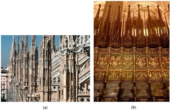 Gothic decorations: (a) decorated elements of buttress structures strengthening the walls and vaults of buildings (Milan Cathedral); (b) characteristic painted and carved decorations of clergy chairs with armrests to support a person in a stationary standing position during a long prayer (Barcelona Cathedral).