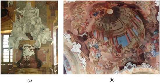 The architectural divisions were supplemented and even covered with decorative sculptures, bas-reliefs, and paintings (Figure 11a). Vegetable forms (e.g., fruit and leaf garlands), spirals, rocailles, obelisks, and wall hangings were used. Sculptures of saints and the most important people of the era, as well as cupids and putti, created spatial decorations. Allegorical scenes in the form of illusions were painted on the ceilings and vaults of representative interiors, including a distant aerial perspective of the open sky (Figure 11b). The interior plastic casings and furniture furnishings were combined, ordered, and strictly arranged according to the axis of symmetry. This principle changed in the Rococo style in the 18th century. Initially, asymmetric decorative forms were preferred.