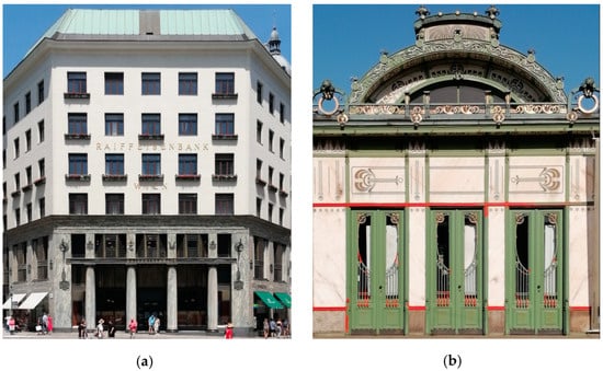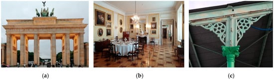 The classic style combined with new utility needs was influenced by the use of new building and finishing materials. In the mid-19th century, iron structures (often still decorated) made of cast iron or rolled steel were increasingly used (Figure 12c). The elements were already produced industrially. They were also packaged and used in various buildings. These construction methods were already the forerunner of 20th century unification and prefabrication in architecture and construction. Classicism, modeled on ancient architecture, was imitated in later eras, e.g., in the Napoleonic empire style, Nazi and Stalinist architecture (socialist realism) [].