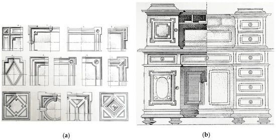 - Krauth, T.; Meyer, F.S. Die Gesamte Möbelschreinerei mit Besonderer Berücksichtigung der Kunstgewerblichen Form; Verlag von E. A. Seemann: Leipzig, Germany, 1902; Tables 6 and 84. [Google Scholar]