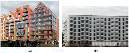 The lighting and colors used are also important to the sense of beauty in the built environment. The influence of different colors on the environment and humans has been known for a long time [,]. A lack of color causes monotony and boredom in the perception of space. The color compositions of buildings are often an expression of the individual preferences and aesthetic tastes of architects or investors. They can also be analyzed rationally. When designing, it is recommended to take into account the physical and psychological impact of colors on humans. Designers often look for order, balance, and harmony in color combinations [].
