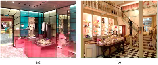 Commercial interiors were selected for evaluation. The leading industries are the sale of clothing and various accessories. These stores offer a variety of goods. They are dedicated to various target groups of customers: from the less affluent, to the very affluent, or those with specific preferences. The economic factor is also related to social diversity and the type of people’s needs. The desire to buy is usually not the only reason for visiting shops. The spatial organization of commercial exhibitions and the method of sales determine the functionality of the interior of a store. Free access to goods (self-service) and safety of use (protection against accidents and theft) are of great importance. Attracting and encouraging potential customers to make purchases is a difficult task for the owners of the stores surveyed. The products most essential for life, such as food, are not offered there. Increasing sales is influenced not only by low prices and advertising, but also by positive visual stimuli addressed to customers. In this context, the individual atmosphere in the interior, the beauty of the rooms, and the items well displayed for sale are important. Interior aesthetics are gaining importance in marketing []. Modernist forms, devoid of decorative details, are often used in contemporary stores. They refer to the aesthetic image of the quality of the product (Table 2, case 1). Sometimes very original, controversial, and even futuristic interior design concepts are implemented (Table 2, case 2). They are addressed to people who are more avant-garde or who have specialized needs and passions. These are usually small and very wealthy groups of clients. The situation is somewhat similar to the offer of used items, displayed in a vintage atmosphere (Table 2, case 3). This trade sector has been very popular for years. Consumers make their decisions looking for the values of old functional and aesthetic quality. More and more people also see it as an opportunity for rational, sustainable management of material resources (circulation and recycling of everyday products). In contemporary stores (as well as apartments), historical stylings still work well as a background, for example, for classic, always fashionable clothing (Table 2, case 4). The offer is targeted at customers who are more mature in age and style. Although individual recipients change with age, the target group remains constant, and fashion does too. Finally, many salespeople do not attach importance to original aesthetics and the traditionally understood beauty of the interior (Table 2, case 5). They are only interested in intensive sales, almost in wholesale quantities. Similarly, their customers are willing to give up aesthetic experiences and a more individual atmosphere of the store interiors. The most important thing for them is the ability to choose from a very large assortment and purchase the cheapest products. In this case, the organization and appearance of the exhibition and sales are subordinated to functional considerations. They are associated with the concepts of interwar functionalism.